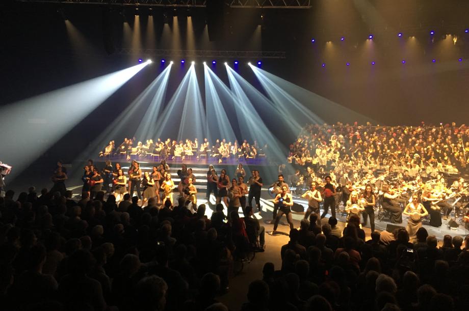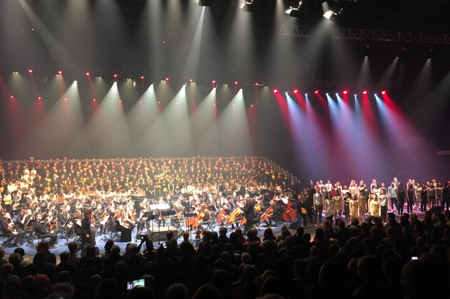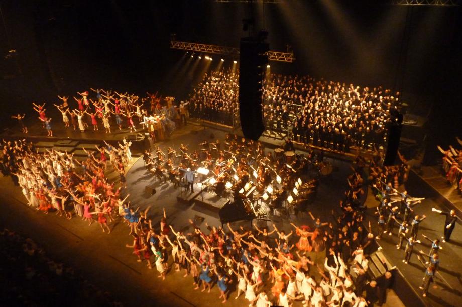 700 Personnes sur scène : musiciens, choristes, danceurs.